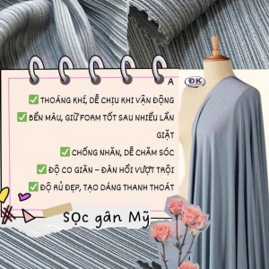 SỌC GÂN MỸ là dòng vải thun với đặc trưng bề mặt có các đường gân nổi chạy dọc. Kỹ thuật dệt độc đáo giúp bề mặt vải có những đường gân nổi, tạo hiệu ứng thị giác sang trọng, đồng thời mang đến sự mềm mại, thoải mái khi mặc. Vải không chỉ có độ co giãn tốt mà còn tạo nên cảm giác mềm mại, làm nổi bật đường nét cơ thể và tạo phong thái hiện đại.