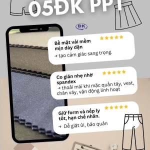 05ĐK PPT là loại vải đặc biệt của Đức Khanh được dệt chéo tinh tế từ sợi Polyester pha Spandex, vải Umi co giãn mang lại sự sang trọng, mềm mại và khả năng giữ form vượt trội. Hoàn hảo cho việc may quần, chân váy và vest mỏng, giúp bạn tự tin trong mọi chuyển động.